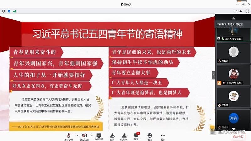 近日,生物工程学院2019级党员、团员参加了院研团委在腾讯会议举办的“弘扬抗疫精神,奋进复兴征程”主题党团活动。此次活动旨在引导广大青年党员群众强化爱国和担当意识,加强思想政治教育,凝聚信心、共克时坚。