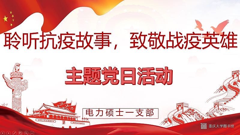 2020年5月14日下午,电气工程学院电力系统硕士生一支部开展“聆听抗疫故事,致敬战疫英雄”主题党日活动,支部全体党员、入党积极分子线上观看重庆大学抗疫故事分享会,共同聆听重庆大学附属肿瘤医院李蕊医师、重庆大学附属三峡医院黄霞医师的抗疫故事。