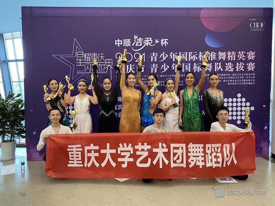 2021年4月30日—5月2日,由重庆市关心下一代工作委员会、重庆市文化和旅游发展委员会、重庆市国际标准舞协会主办的2021重庆市青少年国际标准舞精英赛暨重庆青少年国标舞队选拔赛在重庆国际会议展览中心隆重举行,献礼中国共产党建党100周年,重庆大学学生艺术团在比赛中舞蹈队包揽数项荣誉。大赛共有来自四川、云南、贵州、湖南、湖北、广东、重庆等省市的290支代表队,10000余名选手参赛。