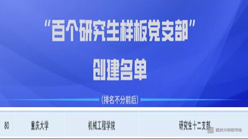 近日,教育部办公厅发布《关于公布第二批全国高校“百个研究生样板党支部”和“百名研究生党员标兵”创建名单的通知》,重庆大学机械工程学院研究生十二支部、电气工程学院博士研究生周言分别入选“百个研究生样板党支部”和“百名研究生党员标兵”创建名单,这是“十四五”开局之年我校研究生党建工作取得的重要突破。